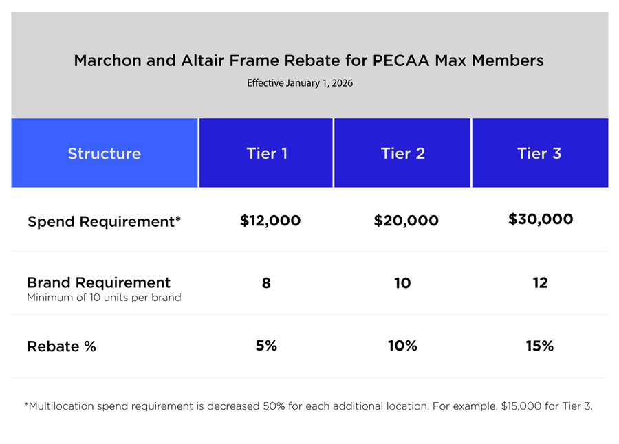 PECAA Max members earn rebates on all Marchon and Altair frame purchases. Effective January 1, this new tiered rebate program is based on brand and spend requirements, allowing you to earn up to 15% back on all purchases through PECAA IncentivEYES®.